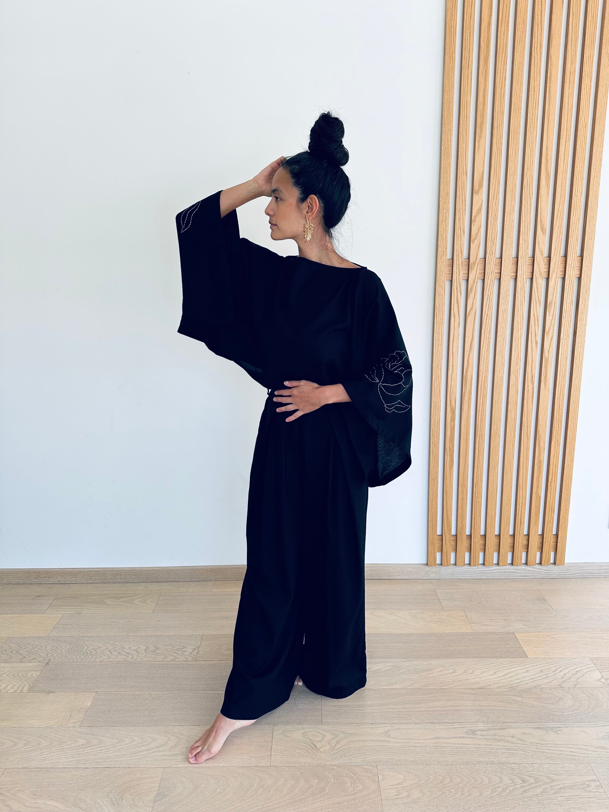 Su corte envolvente y sus mangas amplias evocan alas, vuelo, posibilidad.
