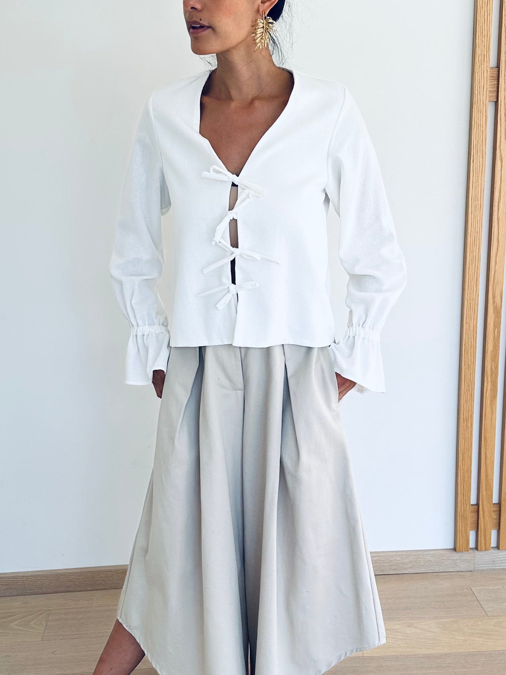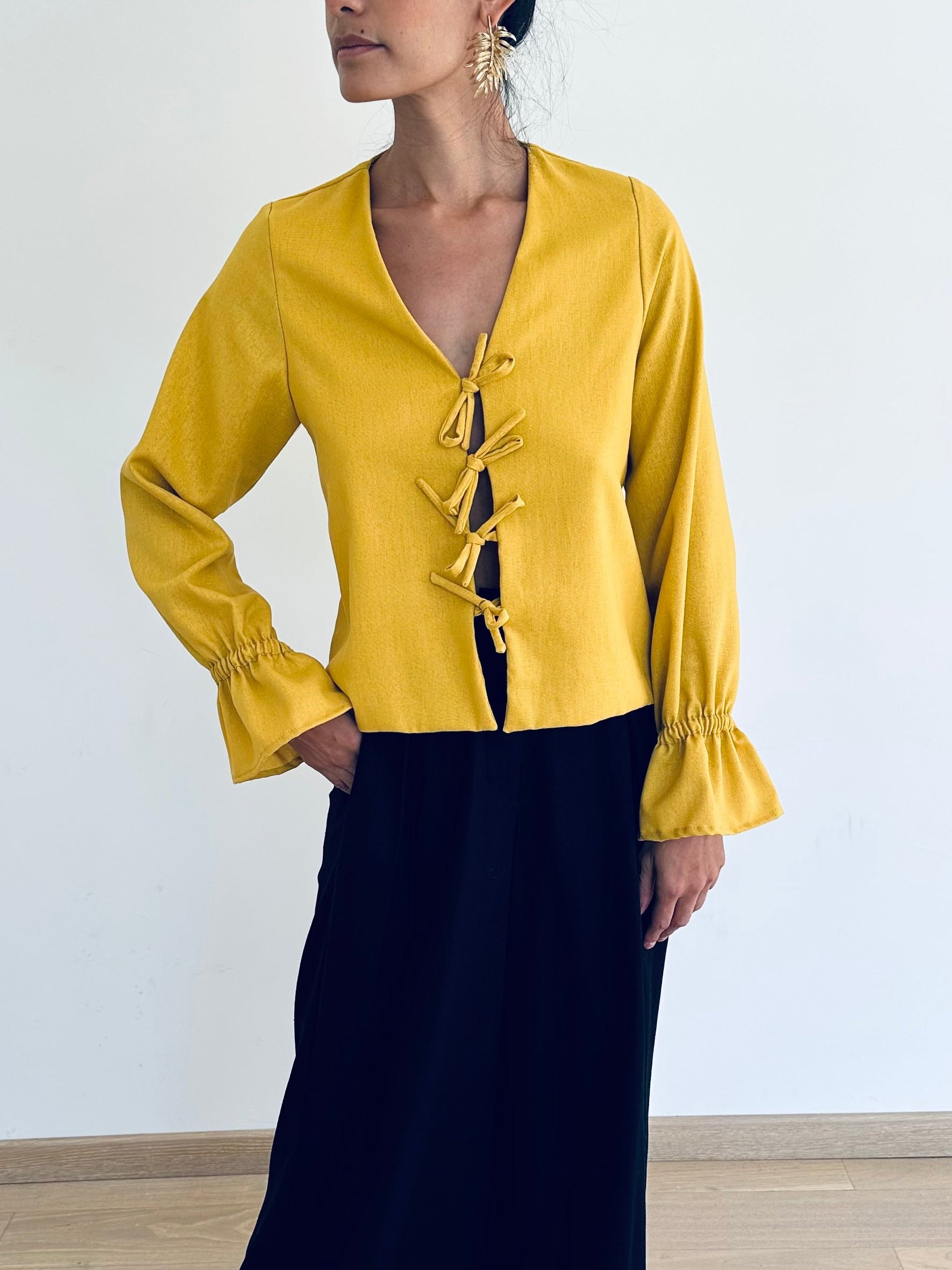 Su diseño fluido con amarre al frente y mangas con sutil volumen la convierte en una pieza femenina, moderna y atemporal.